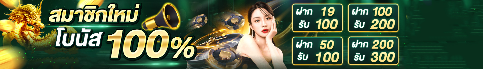 เริ่มต้นด้วยโปรสมัครสมาชิกใหม่ที่ให้โบนัสสูงถึง 100% สำหรับการฝากครั้งแรก สูงสุด 10,000 บาท แค่นี้ก็คุ้มแล้ว แต่ยังไม่หมดแค่นี้นะ ยังมีเครดิตฟรี 100 บาทสำหรับสมาชิกใหม่ทุกคน โดยไม่ต้องฝากเงิน เพียงยืนยันเบอร์โทรศัพท์เท่านั้น ซึ่งเป็นโอกาสดีที่จะได้ทดลองเล่นก่อนตัดสินใจลงทุนจริง